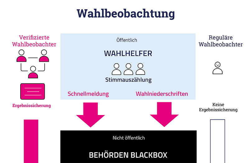 Hier ein Schaubild zur Veranschaulichung des Unterschiedes zwischen verifizierter und nicht-verifizierter, also dem gewöhnlichen Hingehen als Wahlbeobachter und mal Schauen, wie es im Wahllokal so läuft, und verifizierten, flächendeckenden und gerichtsfesten Endergebnissen.